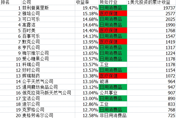 很顯著可以看出,通過(guò)50多年,最掙錢(qián)的職業(yè)十分會(huì)集,主要是日用消費(fèi)品職業(yè)和醫(yī)療保健職業(yè),壟斷了長(zhǎng)時(shí)刻牛股的絕大多數(shù)。排行首位的是出產(chǎn)聞名卷煙品牌萬(wàn)寶路的菲利普莫里斯公司,假如在1957年出資一萬(wàn)元,到今天會(huì)變?yōu)?.97億元!適當(dāng)?shù)捏@人。別的的長(zhǎng)時(shí)刻大牛股也是咱們耳熟能詳?shù)钠綍r(shí)消費(fèi)品和醫(yī)藥生物公司。